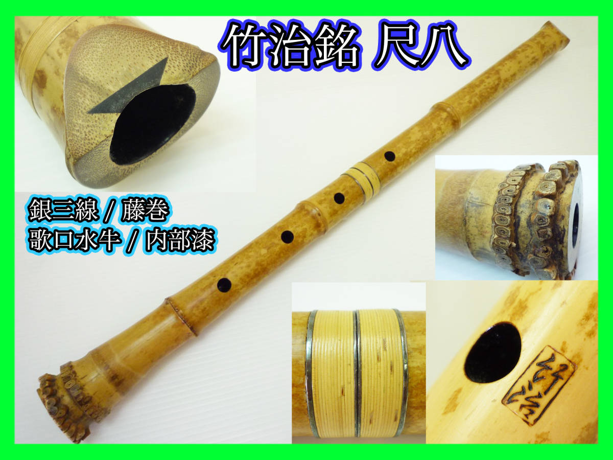 > 旧家蔵出 竹治銘 尺八 銀三線 藤巻 竹製 骨董 約66cm 歌口水牛 中継ぎ 内側漆 和楽器伝統狂言雅楽能古美術 希少 レア マニア 必見_L3