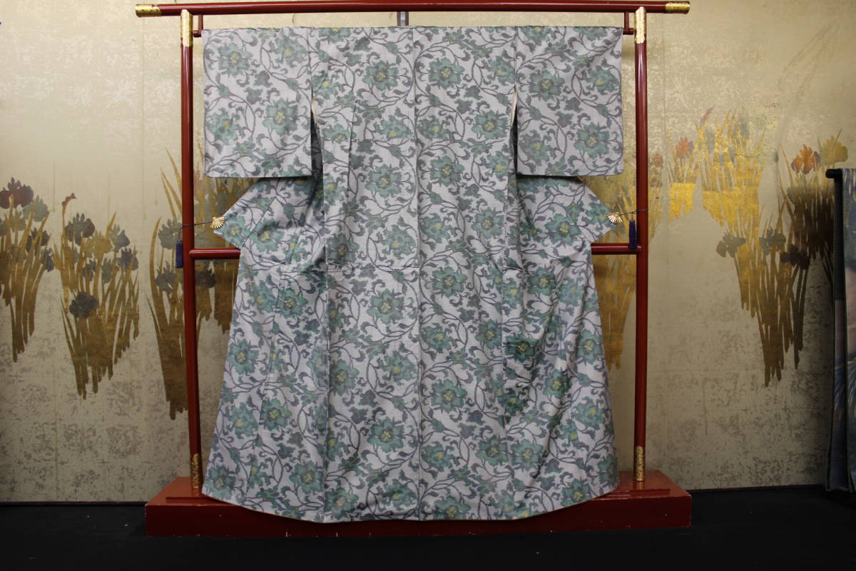 > きもの今昔4936 白大島紬 広衿袷手縫い仕立て 特横総絣白地に唐花のグリーンボカシ柄 汚れなし美品 身丈157cm