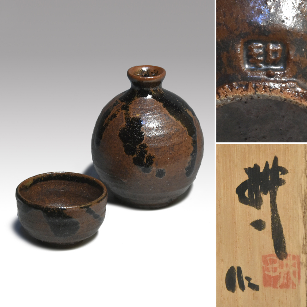 - 人間国宝 田村耕一(造)鉄絵徳利 盃 セット 酒盃 酒杯 酒器 共箱 茶道具 現代工芸 美品 y2219
