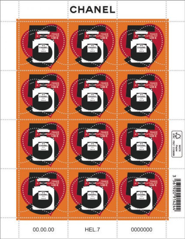 > ● 日本未入荷 CHANEL シャネル NO5 フランス 記念切手 バレンタイン ハート 限定 新品 香水の瓶 2021年 12枚 オレンジ