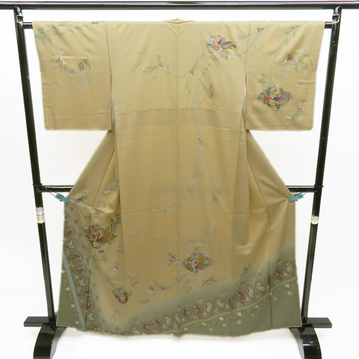 - 【FINAL PRICE】 ★きもの北條★ 金彩 更紗の花鳥 気品豊かな装いに 濃いクリーム色 訪問着 A440-5 M 【中古】