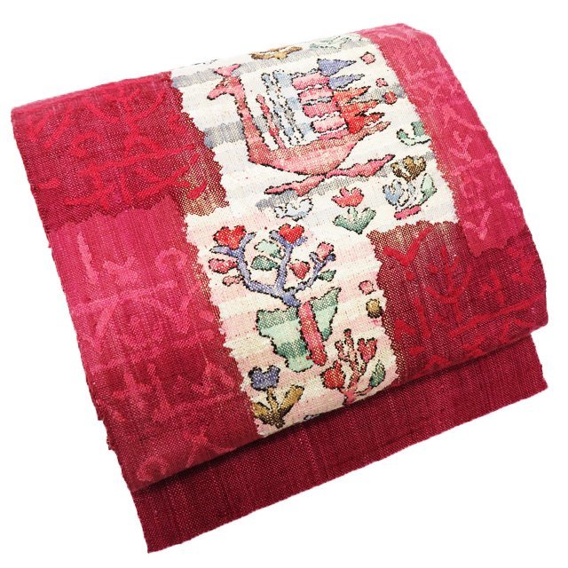 > 名古屋帯 なごや帯 中古 リサイクル 正絹 紬 カジュアル 仕立て上がり お太鼓柄 濃紅色 多色 きもの北條 A862-15