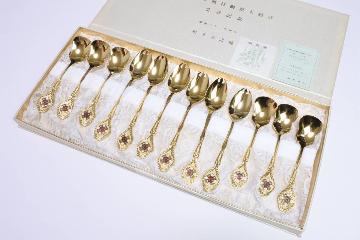 - ☆未使用品☆昭和62年4月勲一等旭日桐花大綬章(旭日章の最上位)受賞記念 金仕上げスプーンセット 松下幸之助 尚美堂 極珍品③