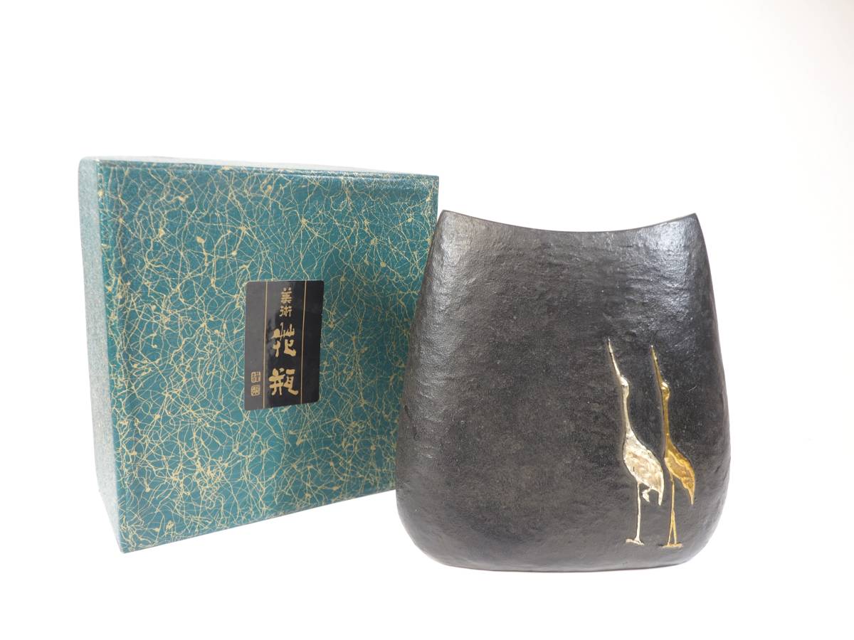 > ビンテージ 高岡銅器 銅製花瓶 二羽鶴 三代目鳳山作 箱付 箱 幅21.5cm 奥行き23cm 花瓶 幅19cm 奥行き8cm 高さ20.5cm 重さ約2.7kg TET506
