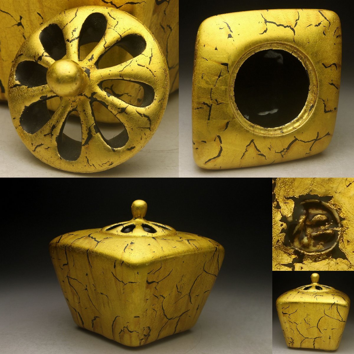 > 【余韻】 清水焼 加藤 仁 作 金箔 菱形 香炉★逸品 茶道具 香道具 無傷美品<同梱可>
