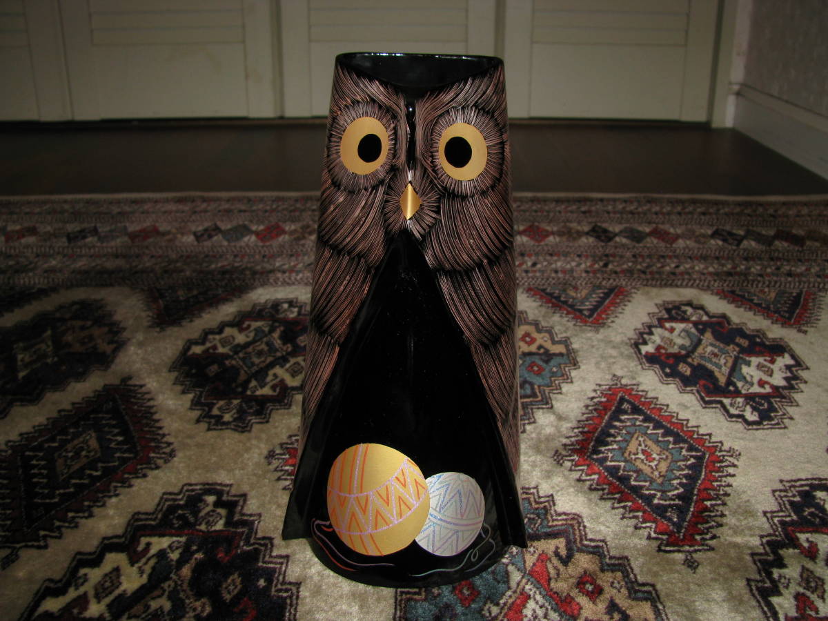 - 秋田 川連漆器 蒔絵 漆 フクロウ 花瓶 佐藤完治作 中古美品