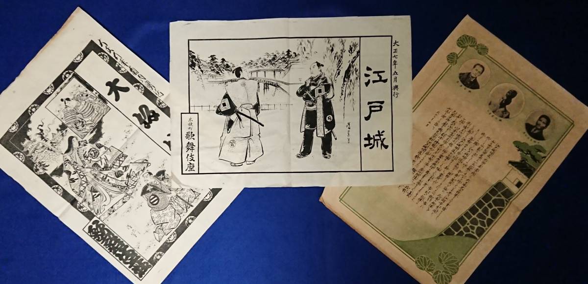 - 大正時代歌舞伎座チラシ3枚セット 江戸城 大坂城 徳川慶喜公 西郷吉之助君 勝安房君