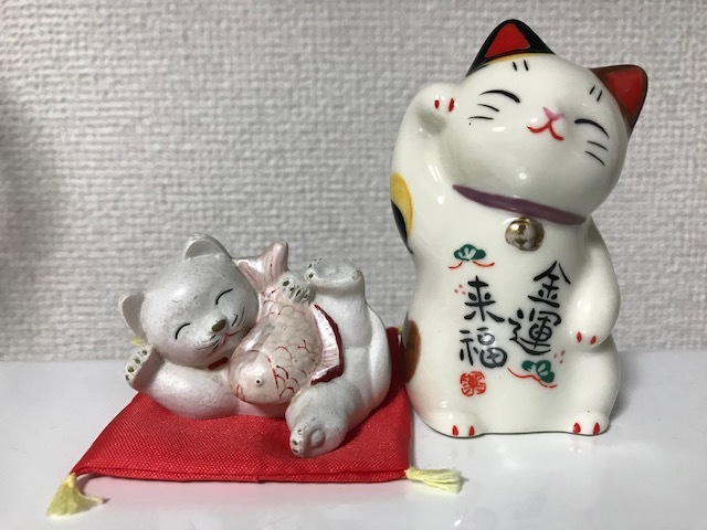 - 当時物 2000年代頃 陶器製 金運来福 招き猫 約76mm 1980年代頃 寝ころび鯛抱き招き猫 セット まねき猫 招福 レトロ 希少