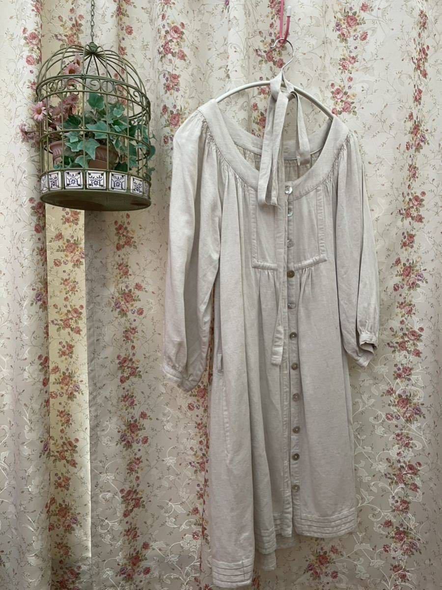 - 七分袖 チュニック 生成り フリー M L ガーデニング 白 系 グレー 系 共布 ヒモ付き