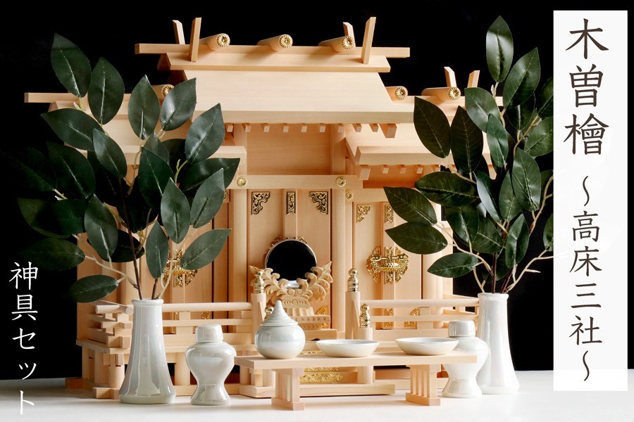 - 匠造り ■ 木曽ひのき ■ 高床式 ■ 屋根違い 三社 小型 ■ 職人の傑作 ■ パール調の神具セット付 ■ 最高級 神棚
