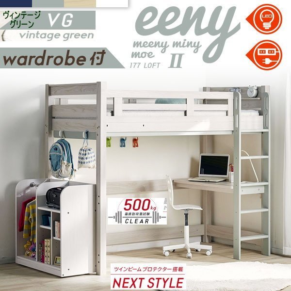 - ロフトベッド イーニー2 ワードロープ棚 業務用 高177cm HI-BASIC WH-VG ホワイト ヴィンテージグリーン 送料無料 耐荷重500㎏