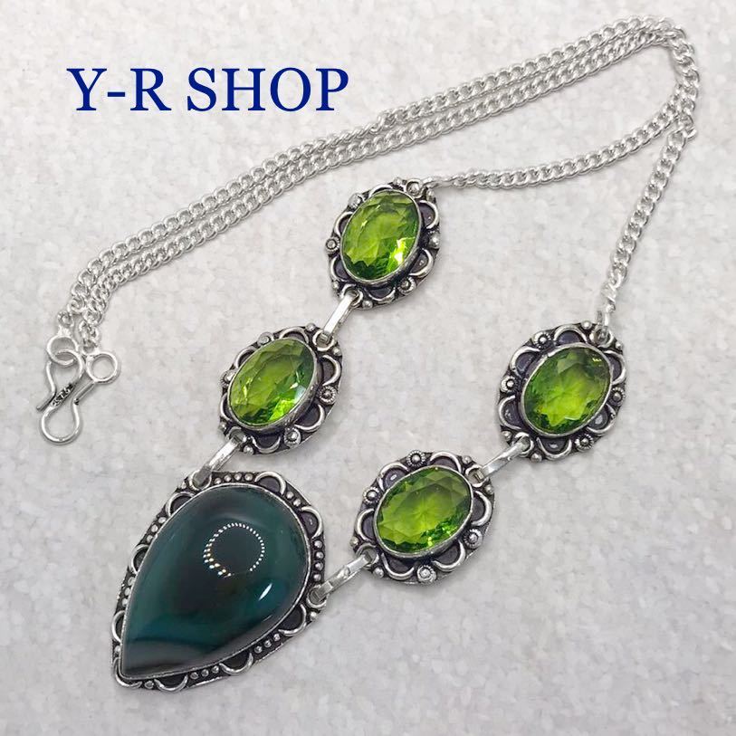 - 天然石★グリーンアゲートとペリドットのアンティーク調ネックレス★レディースペンダントシルバー 925刻印エスニックインドジュエリー新品