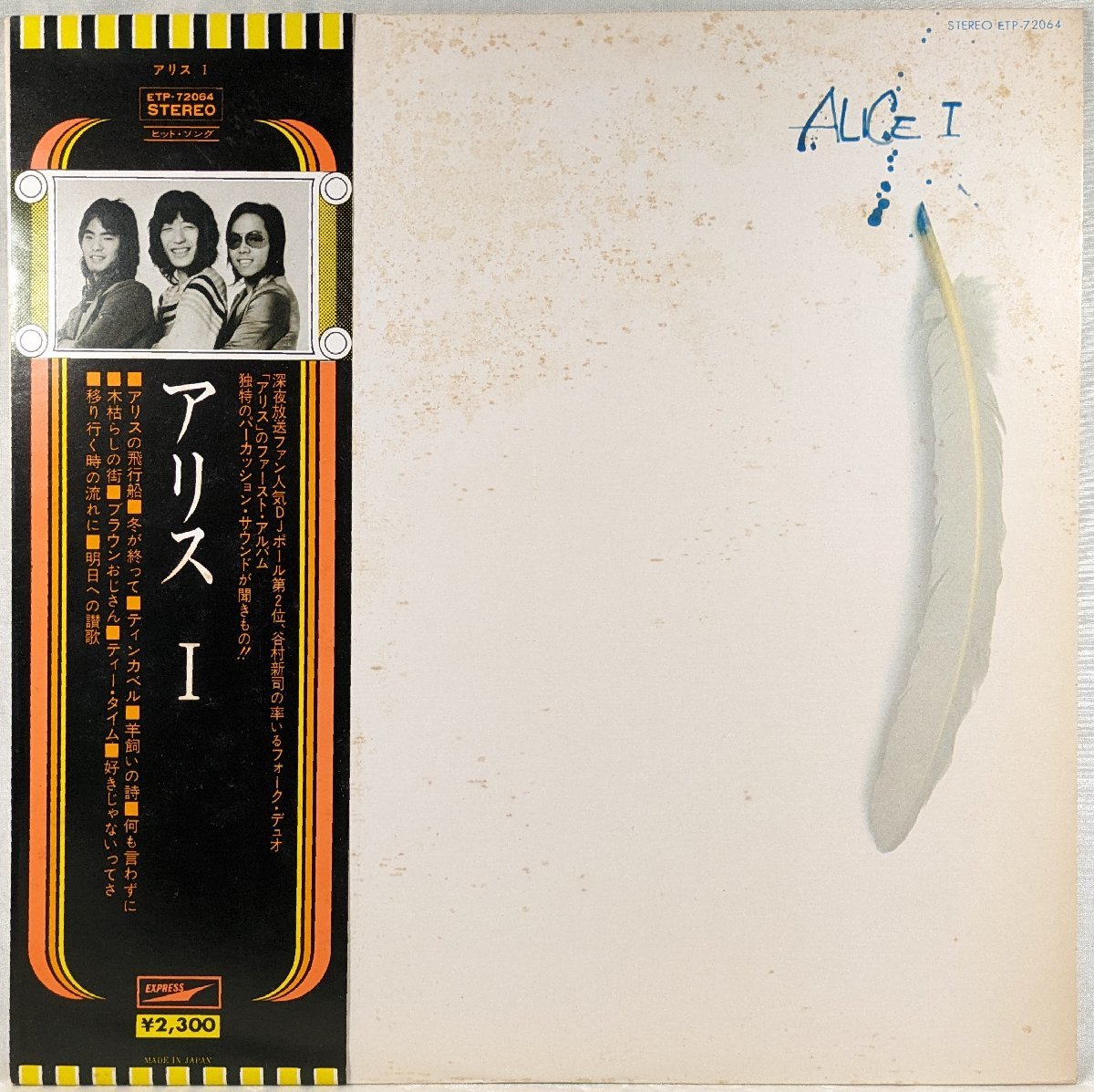 ETP-72064 EXPRESS 帯付★中古LP「ALICE Ⅰ」アリス SIDE A1 Airship of ALICE / アリスの飛行船2 A winter is over / 冬が終わって3 TINKABELL / ティンカベル4 song of shepherd / 羊飼いの詩5 Nothing / 何も言わずに SIDE B1 the cold wind street / 木枯らしの街2 uncle Brown / ブラウンおじさん3 tea time / ティー・タイム4 I don't love you / 好きじゃないってさ5 Time is changing / 移り行く時の流れに6 Anthem for tomorrow / 明日への賛歌 盤質:良好ジャケット:シミあり帯付き歌詞カード付き 谷村新司(たにむらしんじ、チンペイ/リードボーカル、ギター)堀内孝雄(ほりうちたかお、ベーヤン/ボーカル、ギター)矢沢透(やざわとおる、キンちゃん/ドラム) 送料は送料・配送についてをご覧ください。中古レコードに関してご理解のうえご入札ください