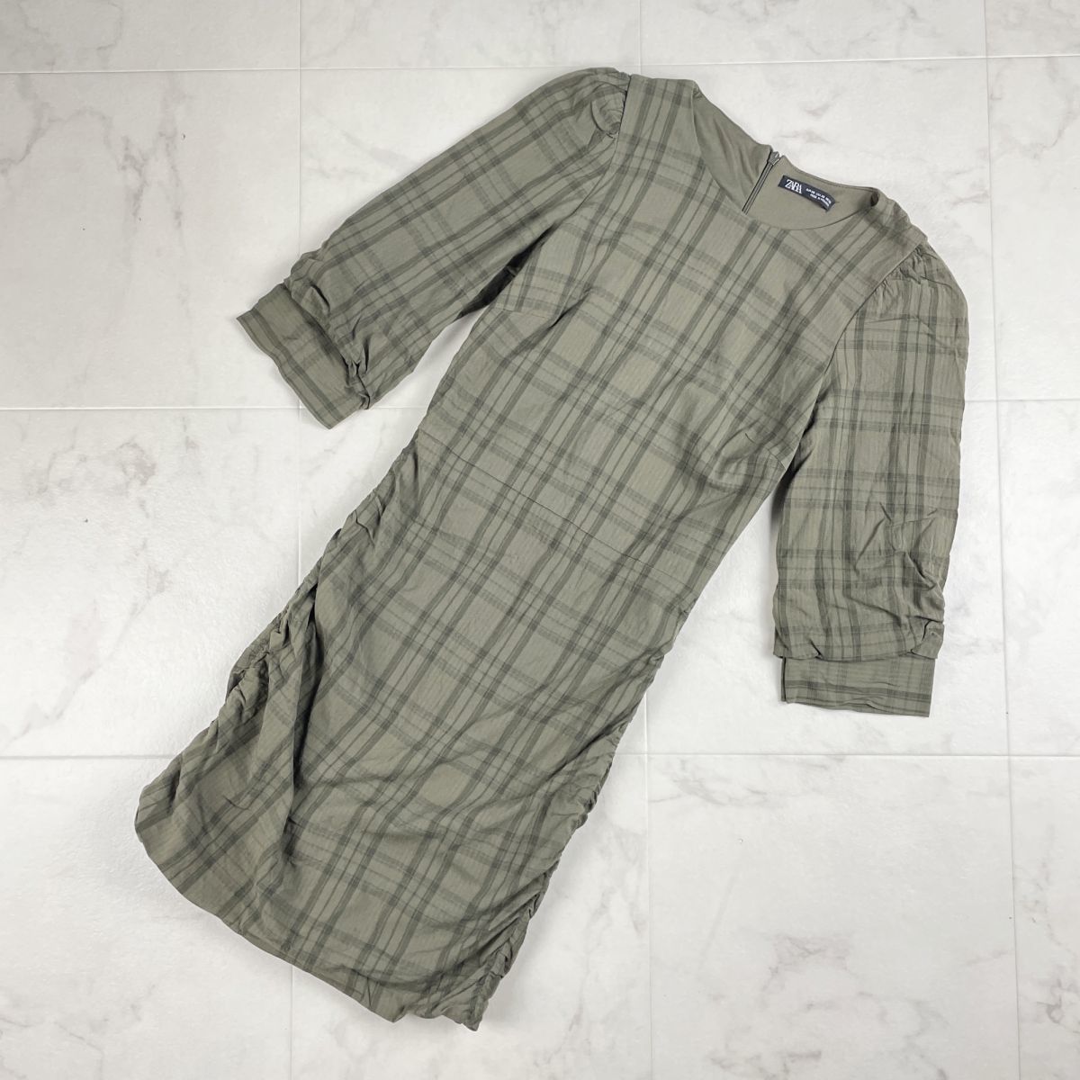 > ZARA ザラ サイドギャザースカート チェック柄 五分袖 バックジップ 膝丈 裏地あり レディース カーキ サイズXS*HC1349