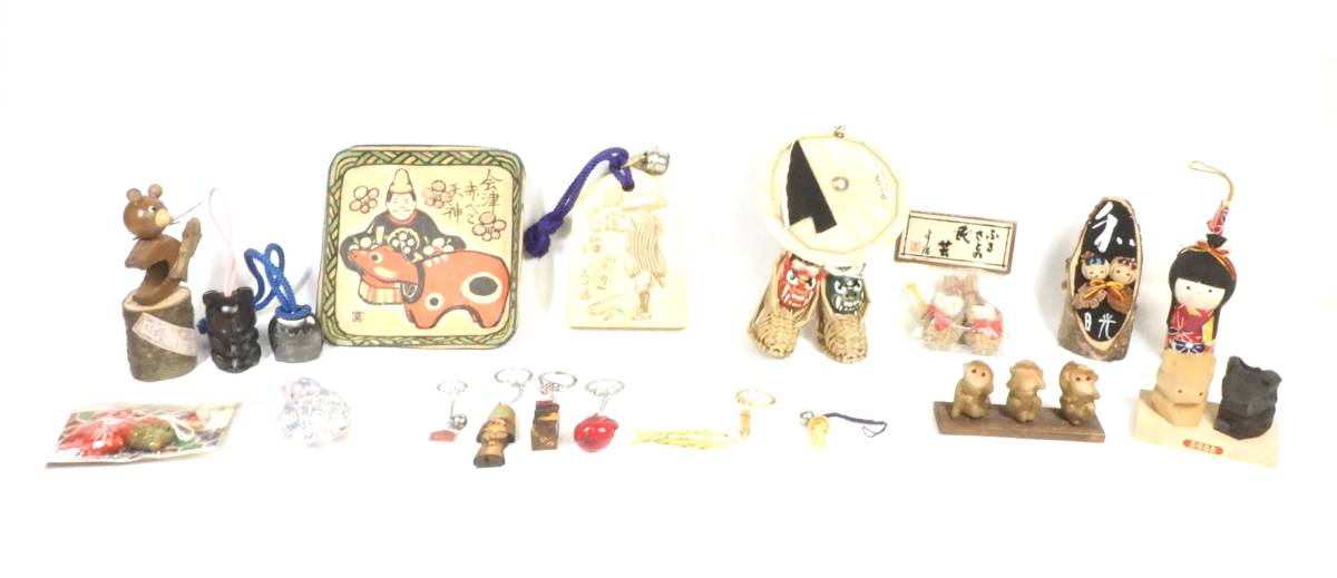 - 日本のふるさと民芸品小物19点セット 「木彫りの熊のストラップ 木版画皿 和紙チャイム人形 におい袋 ベル 等々」1990年代 IHK510