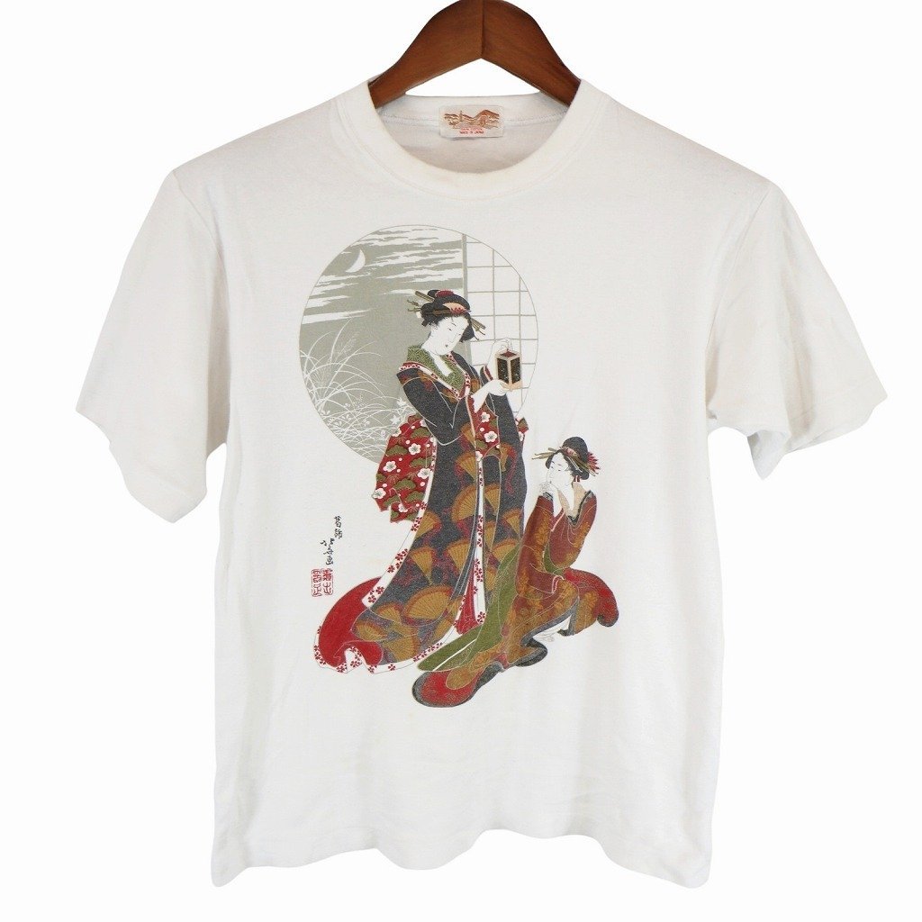 > 90年代 日本製 浮世絵プリント 半袖Tシャツ シングルステッチ 和柄 ホワイト (メンズ S相当) 中古 古着 O5230