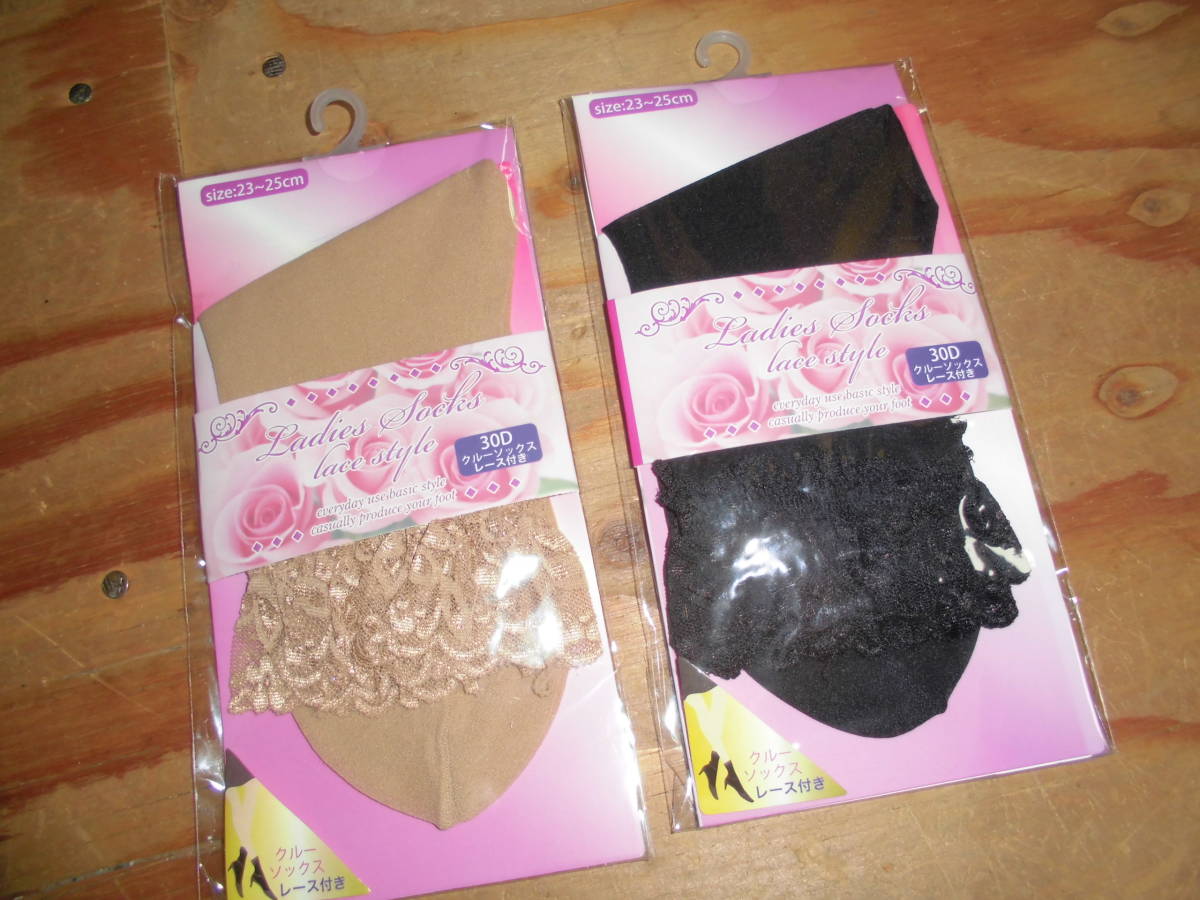 - 2足セット ブラックとベージュ系 レース付きクルーソックス 30D