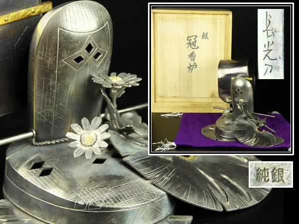- 魁◆名家所蔵品 本物保証 純銀細工 本歌明治期作 超絶技巧 金工象嵌師 長光刀造 本金象嵌純銀無垢花細工冠香炉 世界的名傑作品