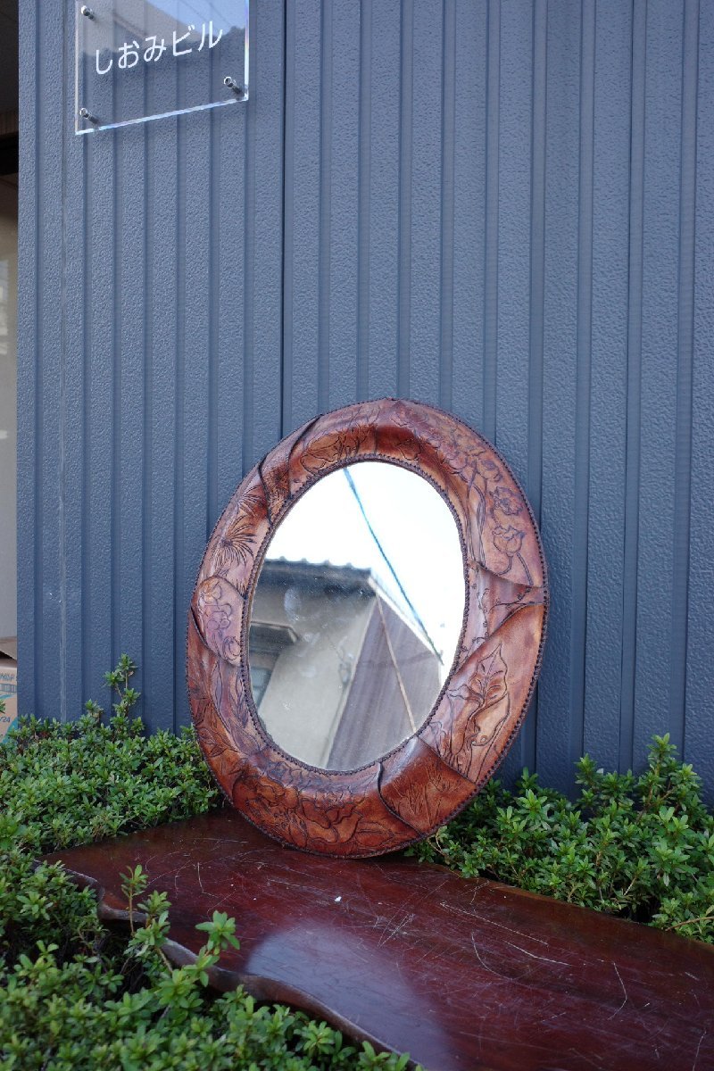 > ○可愛いお花柄 レザークラフト枠の壁掛け鏡 楕円ミラー オーバル レトロ ナチュラル ヴィンテージ 古道具のgplus広島 2310i