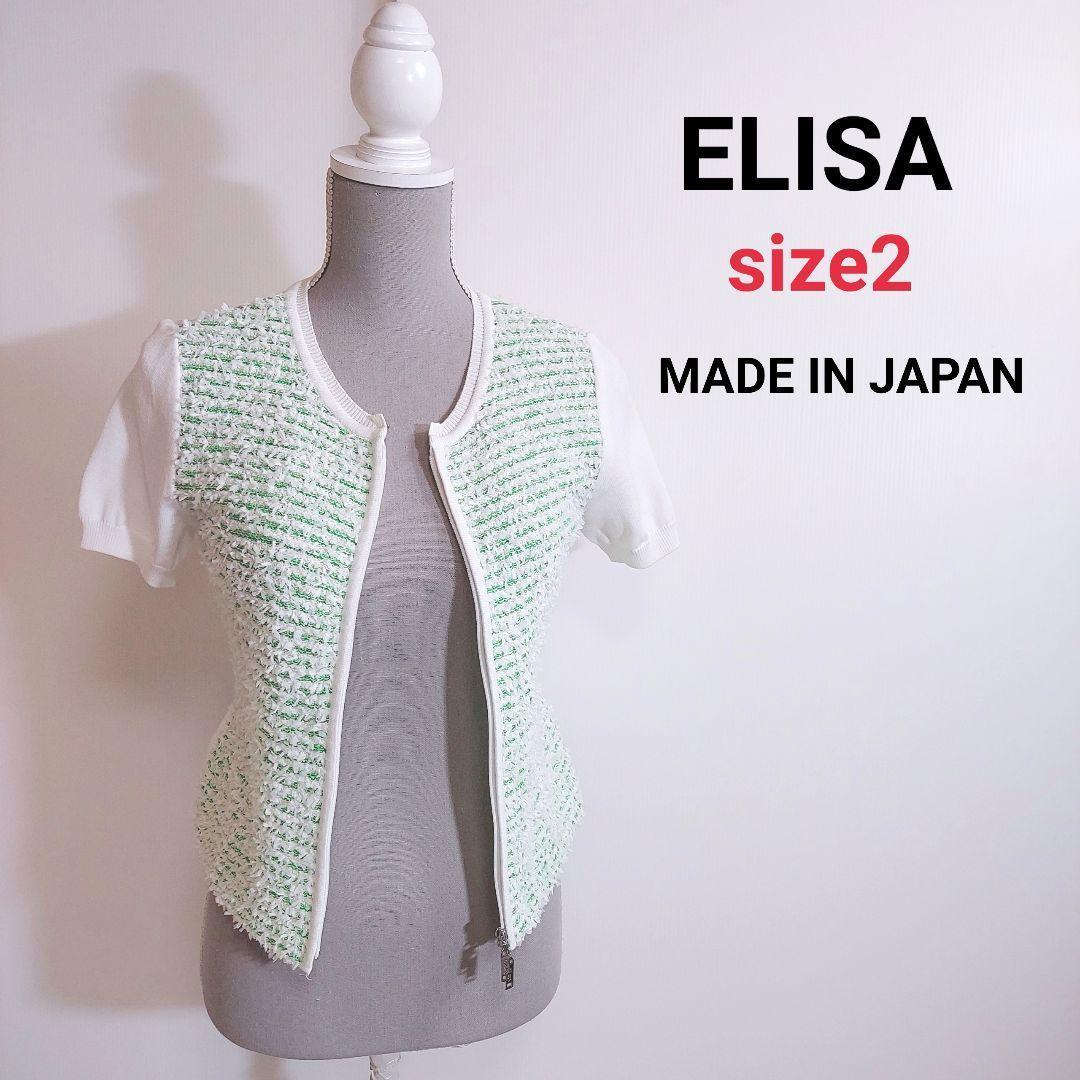 - ELISA レーヨン混コットンニット半袖カーディガン・白&鮮やかな緑グリーン・表記サイズ2 M 日本製 80932
