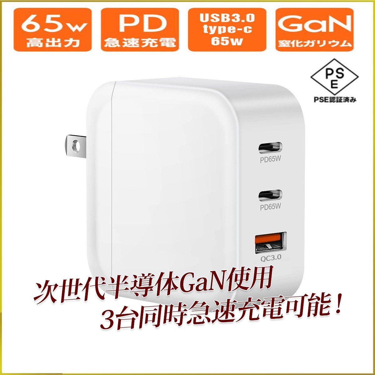 > ★PSE認証済 ★急速充電器 3ポート PD充電器 65W USB QC3.0対応 折りたたみ式プラグ 窒化ガリウム素材使用 ACアダプター【定形外送料無料】