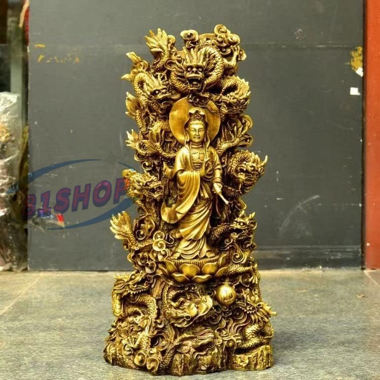 - 「81SHOP」 仏像 龍乗観音 観音像 立像 九龍観音 騎龍観音 龍上観音 仏壇仏像 祈る 厄除け総高39cm