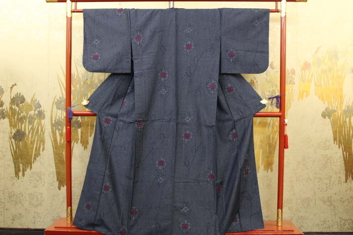 > きもの今昔5991 ウールのきもの 広衿居敷当て付き仕立 濃紺色地枝蔓に花紋飛び柄入り 身丈156cm