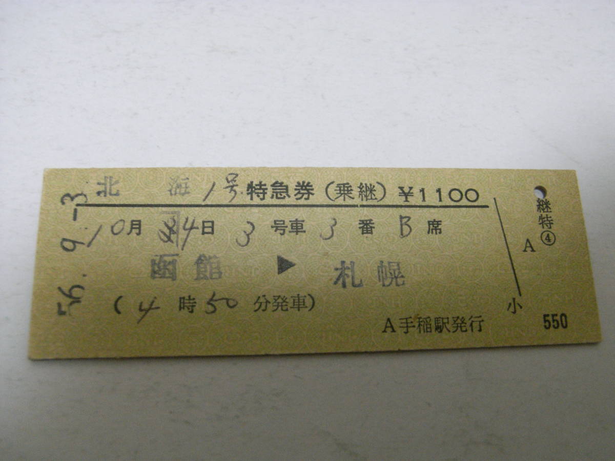- 北海1号 特急券(乗継) 函館→札幌 昭和56年9月3日発行 手稲駅発行