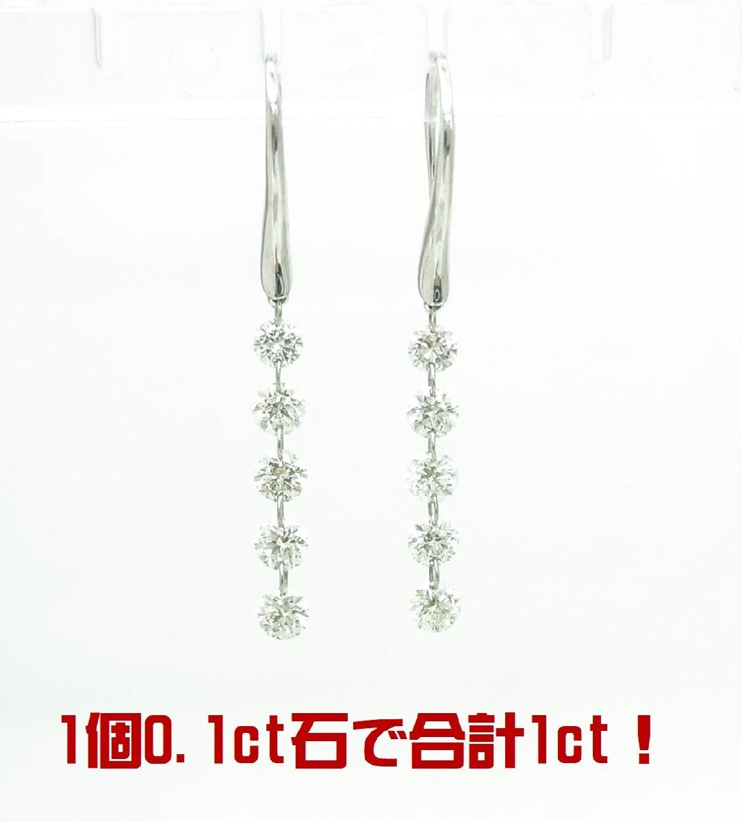 > 天然ダイヤモンド5石連なって小刻みに揺れる 合計1ct 18金ホワイト枠 引っ掛けピアス 動画あり 卸価格 送料込み