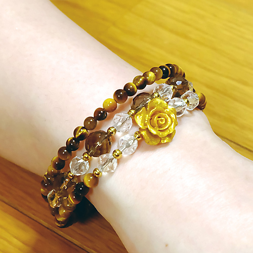 - ★お勧め★エレガント★大人可愛い★バラの貴石★華やかさ★ブレスレット★一輪のバラの花&白水晶&タイガーアイ虎目石&スモーキークォーツ