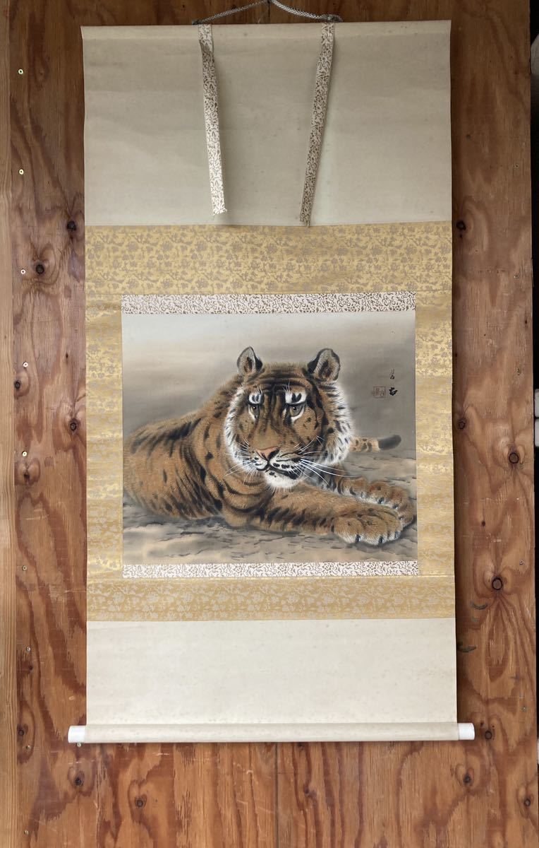 > 【A8697O175】模写 肉筆? 谷沢翠石 猛虎 掛軸 手巻き画絵巻 在銘 共箱付き 落款有り 掛軸 風景画 骨董品 和室 床の間 和風