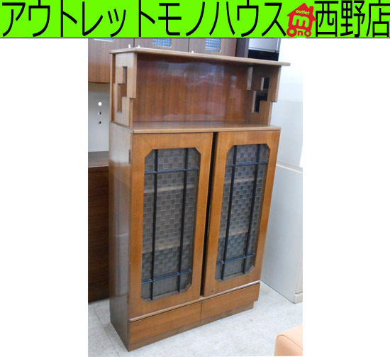 昭和レトロ 飾り棚付き キャビネット W85D29.5H17.5 木製 チェッカーガラス 古家具 古民具 古道具 札幌 西野店