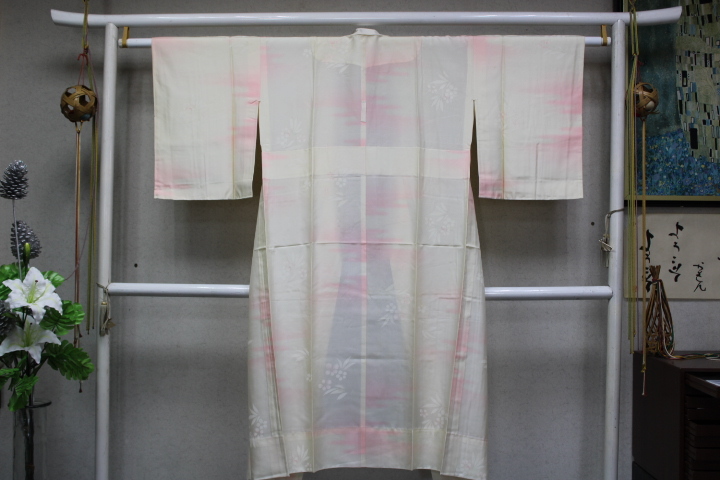 > きもの今昔6069 長襦袢 広衿袖無双身頃単衣仕立て 正絹精華織地 淡いピン黄霞ボカシ 身丈125cm