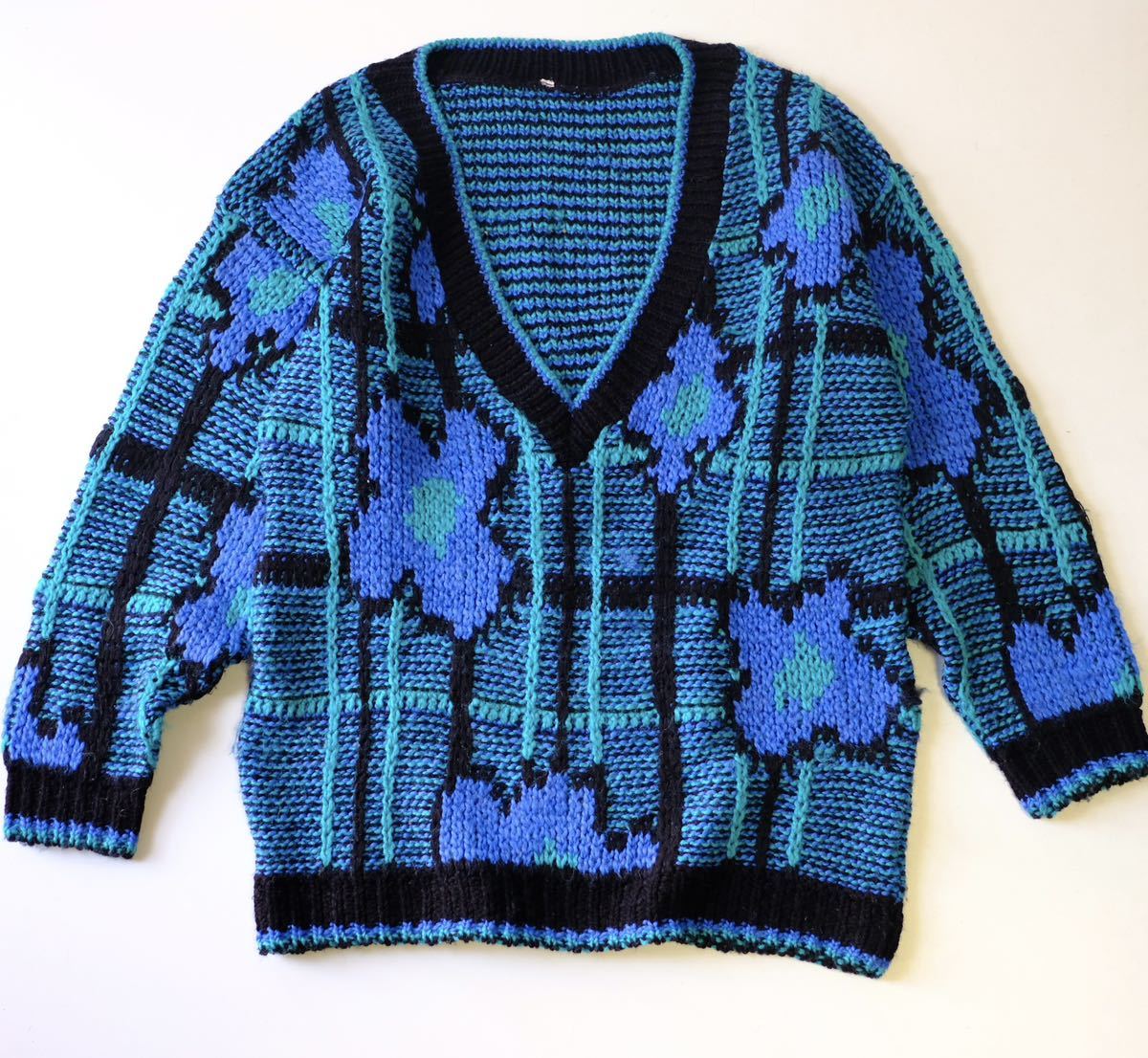 - 【1960〜70s】ユーロヴィンテージ ハンドニットセーター Vネック ビンテージ ローゲージ 花柄 エクアドル デザイン アート