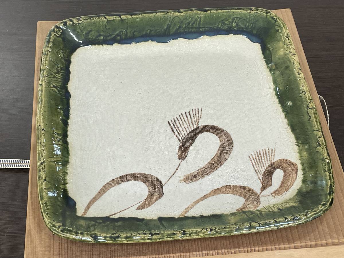 - ★【赤津焼 瀬戸焼】東窯 中島春草 織部 飾皿 (鉄絵大皿 尺皿 角皿)★共箱付き
