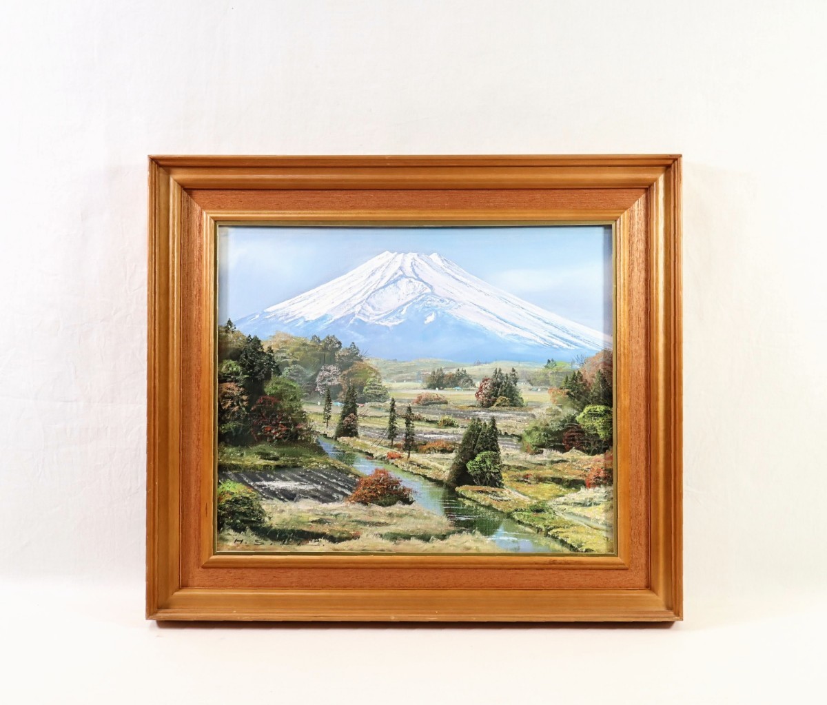 > 真作 佐田光 油彩「富士山」画寸 F8 岐阜県出身 應美会会員 裾野から望む雪化粧の富嶽と麓の山村が広がる日本の素晴らしい原風景 8262