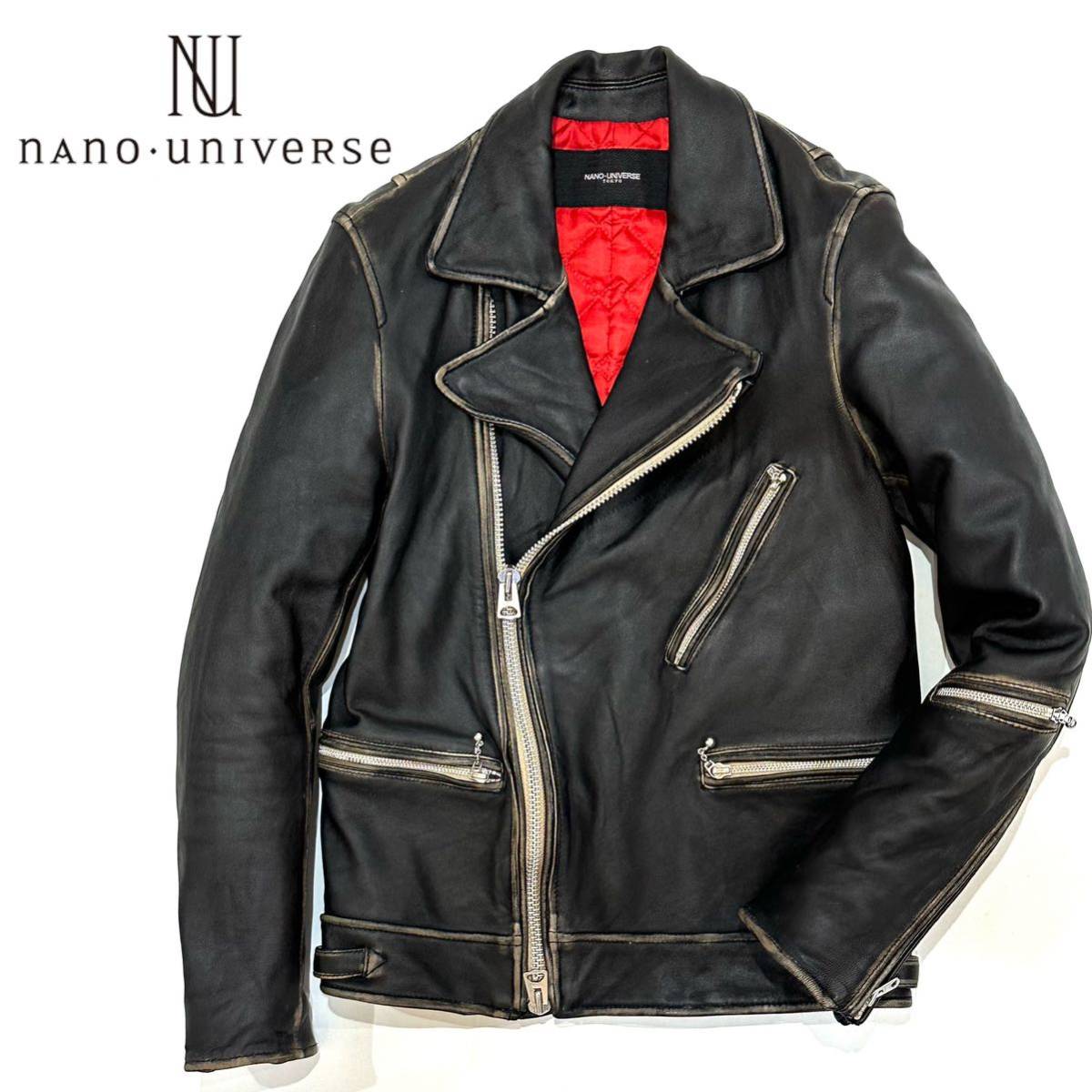 - 美品!! nano universe 羊革 ラムレザー 中綿入り ユーズド加工 ダブルライダース ジャケット(S)ブラック メンズ ブルゾン NUC63L01080SH