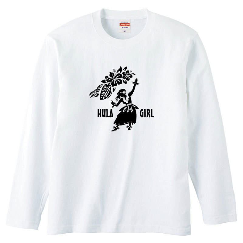 - レディースM対応(タグ表記男女兼用S)/ホワイト*モノクロダンシングフラガール&ロゴ*長袖/Tシャツ/フラダンス/ハワイ/送料無料【tl084】