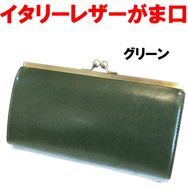 - グリーン イタリーレザー がま口 長財布 25 ロングウォレット