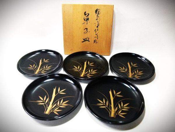 - 【睦】輪島塗竹蒔絵 金蒔絵 菓子皿 5枚 木皿 天然木 本漆器 茶道具 共箱■