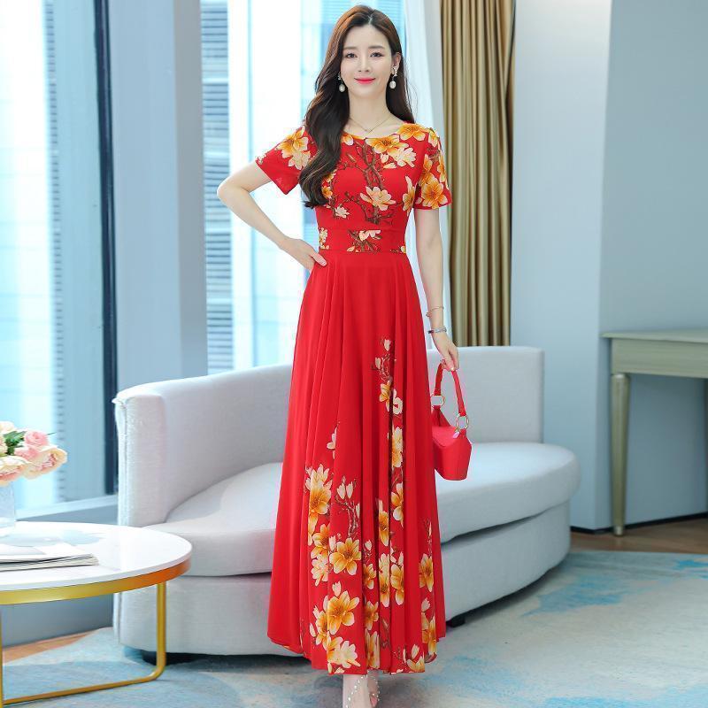 - 【レッド花柄★L】Aライン マキシ丈フレア ドレス ワンピース