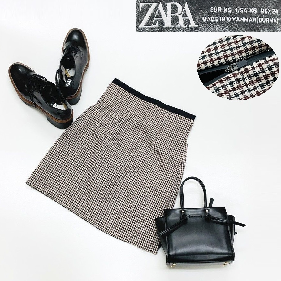 > /XS/ ZARA ブラウンチェック ミニスカート レディース タグ カジュアル ボトム ファスナー フェミニン 大人可愛い デイリー ザラ