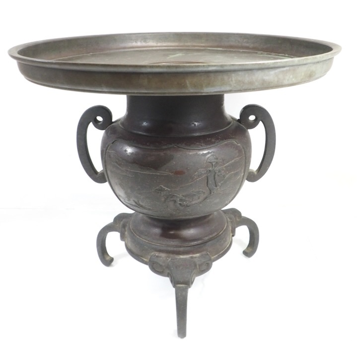 - 昭和期ビンテージ 茶道具 金属工芸 銅製 御玄猪 「銅製双耳窓絵山水松図浮き彫り薄端」裏千家 1970年代 花器 華道具 銅器 古道具 KEN512
