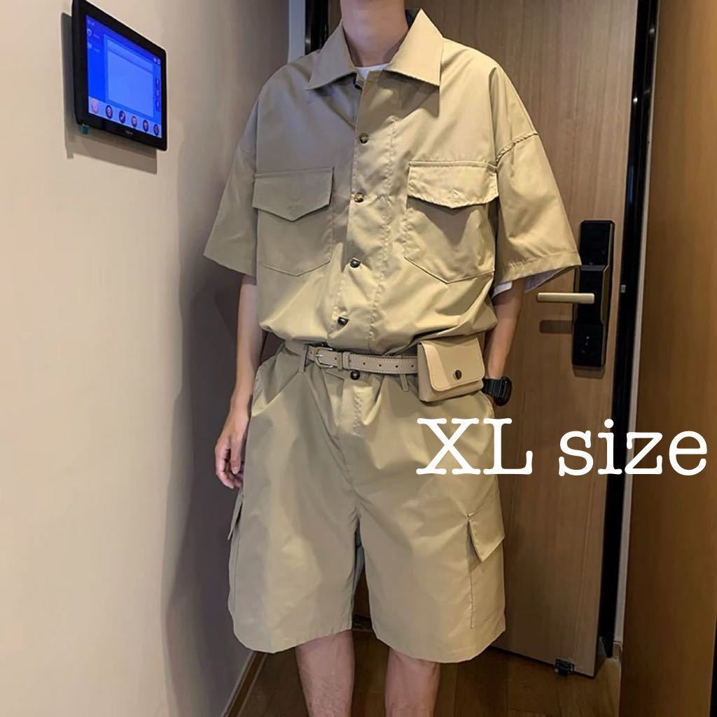 - セットアップ つなぎ 作業着 サロペット オーバーオール オールインワン アウトドア 部屋着 ポーチ 半袖 短パン ベージュ XL