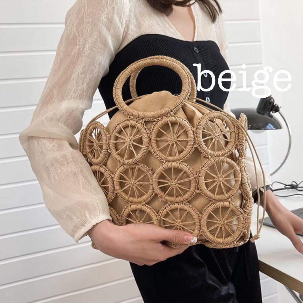 - カゴバッグ バッグ 巾着 付き 鞄 カバン ハンドバッグ バスケット 編み込み ウッドハンドル トートバッグ ピクニック ベージュ 茶系