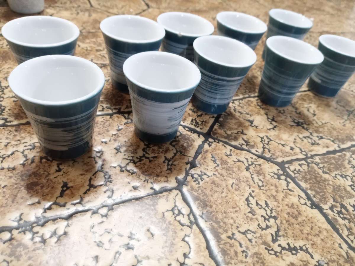 - 【旧家の蔵から】昭和中期 10客揃え 白刷毛 青磁ぐい呑み 陶器 日本製 懐石料理 日本料理 |012724