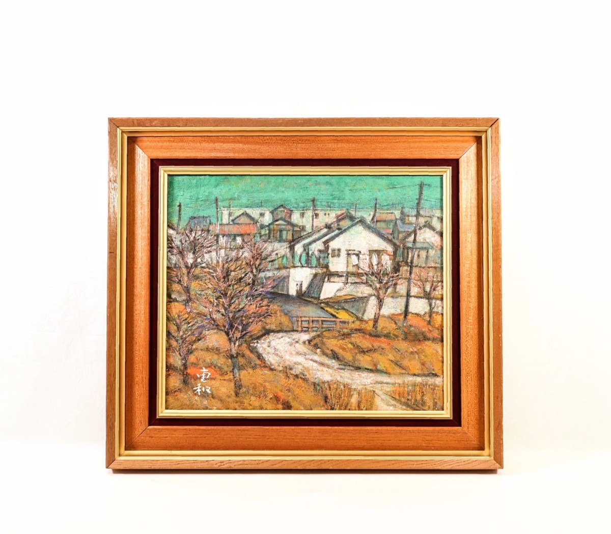 - 真作吉川重和 1971年日本画「藤山台団地」画寸 53cm×45.5cm 10号 日本美術院院友 愛知県春日井市、開発後、間もない頃の町並み風景 8426