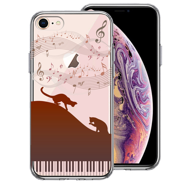 - iPhone7 iPhone8 ケース クリア ピアノ シルエット猫 ブラウン スマホケース 側面ソフト 背面ハード ハイブリッド