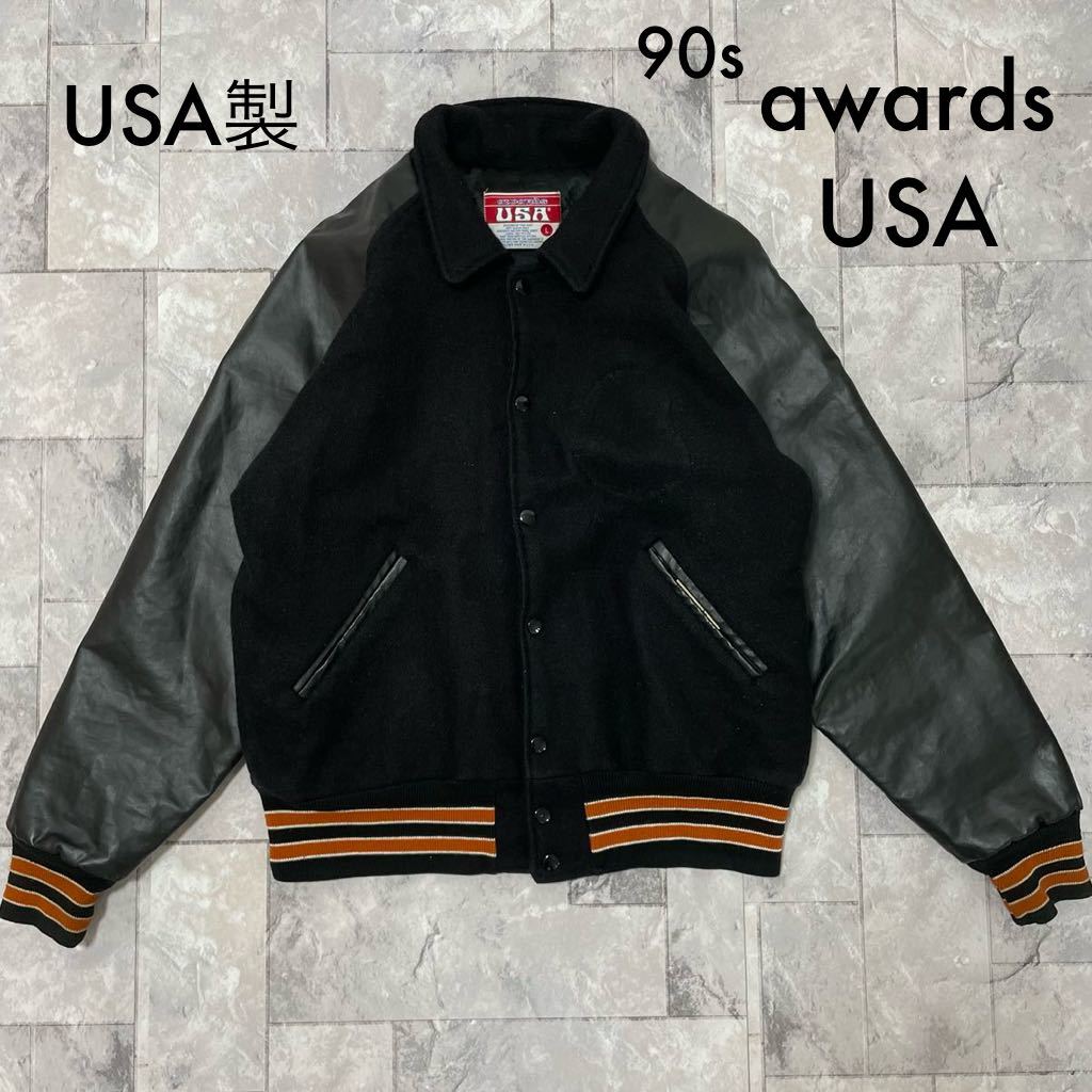 > 90s USA製 awards USA ウールスタジャン レザー 袖革 レザー切替 アワードジャケット スタジャン ヴィンテージ サイズL 玉SS1382
