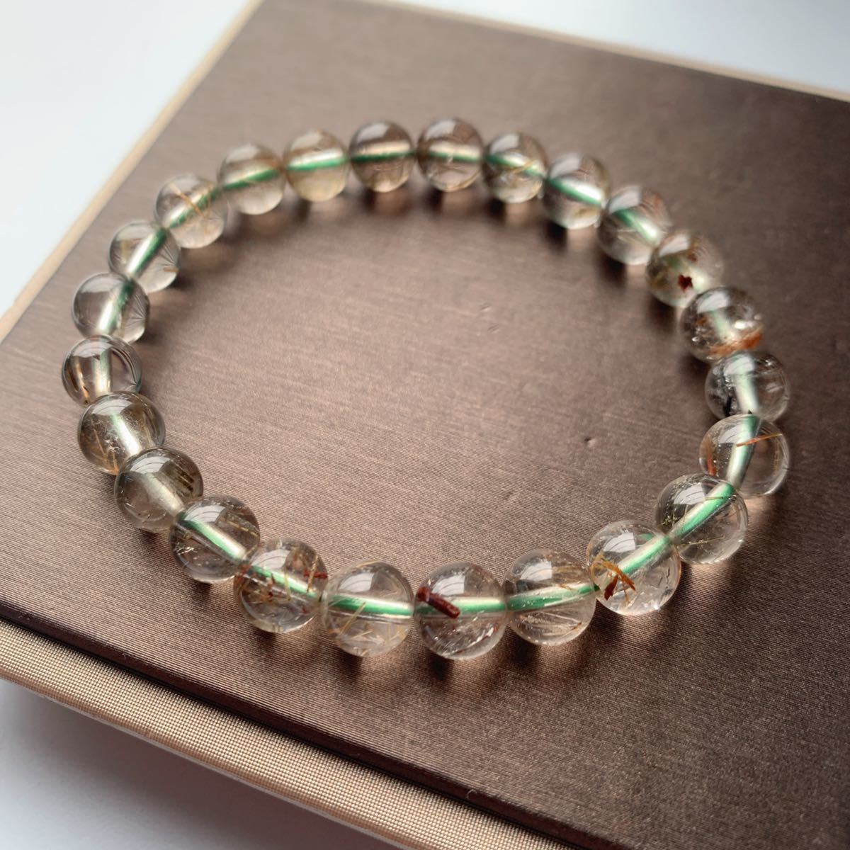 - ◇ルチルクォーツ(緑針水晶)+黒針水晶一粒◇虹入り◇パワーストーン◇ブレスレット◇天然石◇巾着袋付き◇レゼントにも 010B11801